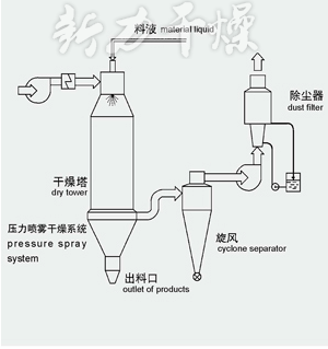 本機(jī)是將料液壓入位于塔體頂部的噴嘴霧化成微小霧滴,同塔頂熱風(fēng)平行而下完成干燥。該機(jī)具有收塵率高,無粘壁、節(jié)能高效等特點(diǎn),特別適用于熱敏性物料干燥。廣泛應(yīng)用于食品染料、中間體等行業(yè)。
